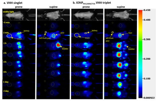Representative in vivo serial fluorescence images and region of interest (ROI) analysis of singlet domain antibodies (VHH) singlet (a) and iron oxide nanoparticlePEG2000/750 (IONPPEG2000/750) VHH triplet (b). ROIs were drawn to track the fluorescence signal change of major ROIs including kidney and brain (prone position), left front paw, and liver (supine image) over time. Scale bar represents near-infrared (NIR) image intensity measured by Pearl. (a) In vivo serial fluorescence prone and supine position images before and 2 min, 1 h, 2 h, 4 h, 8 h, 1 day, and 2 days after IV bolus injection of VHH singlet. (b) In vivo serial fluorescence prone and supine position images before and 2 min, 1 h, 2 h, 4 h, 8 h, 1 day, and 2 days after IV bolus injection of IONPPEG2000/750 VHH triplet.