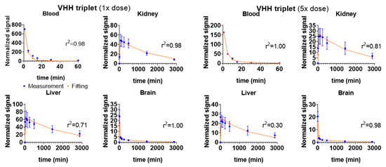 In summary, we found that the kinetics of VHHs and VHH-conjugated iron oxide nanoparticles were clearly related to their size. The smallest sized VHH singlets were cleared mostly by the kidneys. As the size increased, the liver became progressively more dominant in the uptake and clearance of VHHs/nanoparticles. These findings are consistent with the hypothesis that the NIR imaging for PK study can provide information about relative nanoparticle/VHH concentration changes in mouse tissues and are in line with previous knowledge about renal filtration. It is known that the threshold of glomerular filtration for macromolecules and nanoparticles is between 5 and 8 nm with progressively decreasing filtration as molecular size increases [53,54,55]. The PK model constructed in this study had five compartments: blood, kidney, liver, brain, and brain extracellular. For model fitting, blood compartment kinetic data were needed. However, NIR signal from the blood compartment could not be directly measured using the Pearl system in vivo. Ex vivo experiments were therefore performed to understand the blood NIR signal change after IV injection of VHHs and to help with the model fitting. Thus, this approach should be considered a hybrid, with direct sampling of blood, and serial NIR imaging-based sampling of other compartments.