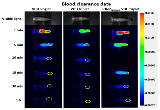 Ex vivo fluorescence images of blood. Scale bar represents NIR image intensity measured by Pearl. Mouse blood was collected at 1 min, 5 min, 10 min, 15 min, 30 min, and 1 h after intravenous (IV) injection of VHH singlet and VHH triplet. Mouse blood was collected at 1 min, 5 min, 15 min, 30 min, and 1 h after IV injection of IONPPEG2000 VHH triplet. ROIs were drawn for NIR signal analysis.