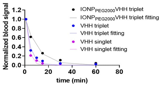 Then, the blood clearance curves were fitted using a single exponential equation (Figure 5). The NIR fluorescence images of ex vivo blood indicated fast blood clearance rate of VHHs and slower rate of VHH-IONP. Most of the materials were cleared out of the blood within the first 1 h post injection. The fitted half-lives were 7.09 min, 2.86 min, and 1.94 min for IONPPEG2000 VHH triplet, VHH triplet, and VHH singlet respectively.