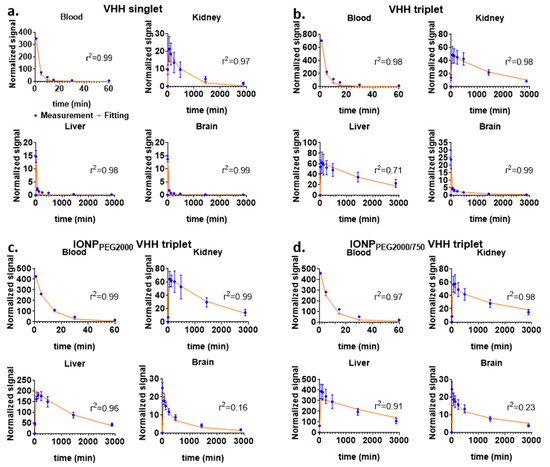 Fitting of the five-compartment model solutions to the experimentally measured fluorescence data. Fitting of the model simulated solutions (red line) and the measured normalized NIR signals (blue dot) of major organs after IV injection of VHH singlet (a), VHH triplet (b), IONPPEG2000 VHH triplet (c), and IONPPEG2000/750 VHH triplet (d). Error bars represent standard deviations.