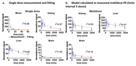 As a test of the accuracy of the model, we used single dose-based kinetic parameters to predict the kinetics after multiple doses. An experiment with both single-dose and multidose IV injection was performed using VHH triplet. Single dose PK measurements were performed by intravenously injecting 0.1 mL VHH triplet into three mice and an additional group of five mice received three doses of the same 0.1 mL VHH triplet with time intervals of 5 min between doses. The normalized averaged single dose mice data was fitted using the five-compartment model. The five-compartment model fitted the single dose data well, with r2 values of 0.9947, 0.9747, 0.5998, and 0.9995 for blood, kidney, liver, and brain compartment, respectively. Then the predicted multidose kinetics were calculated based on the model with no additional free parameters through superposition. Finally, the single dose model-based predicted multidose kinetics were compared with the measured multidose kinetics (Figure 8a). The model-based predicted multidose kinetics closely followed the trend of the experimentally measured multidose kinetics (Figure 8b). Thus, the multidose data was moderately well fit by the model based on PK parameters derived from the single dose data, with r2 values of 0.5529, 0.4701, and 0.1855 for the kidney, liver, and brain compartments.