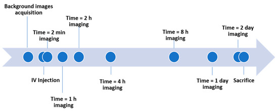 Mice were anesthetized with 60% oxygen/40% medical air gas mixture with 5% isoflurane for induction of anesthesia and 1.5% isoflurane level for maintenance. Mice were imaged using the Pearl Trilogy Near-Infrared Fluorescent and Bioluminescent small animal imaging system (Licor, Lincoln, NE, USA). The specific parameters for NIR imaging were resolution = 170 um, fluorescence channel at 800 nm (excitation at 785 nm and emission at 820 nm) for FNIR dye. NIR images were collected before and at time 2 min, 1 h, 2 h, 4 h, 8 h, 1 day, and 2 days post IV injection (Figure 9) using Pearl. After end-point imaging, mice were euthanized by transcardial perfusion using 1X PBS with heparin under 5% isoflurane.