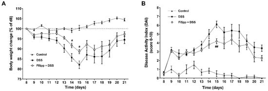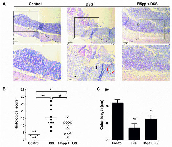 2.1. Prophylactic FI5pp-Treatment Attenuates the Clinical Course of DSS-Induced Colitis