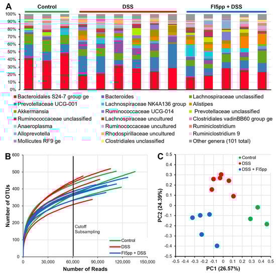 2.3. Prophylactic FI5pp-Treatment Attenuates Bacterial Diversity in Mouse