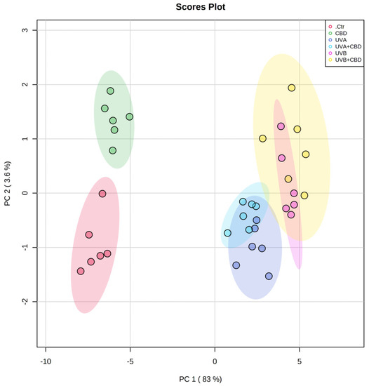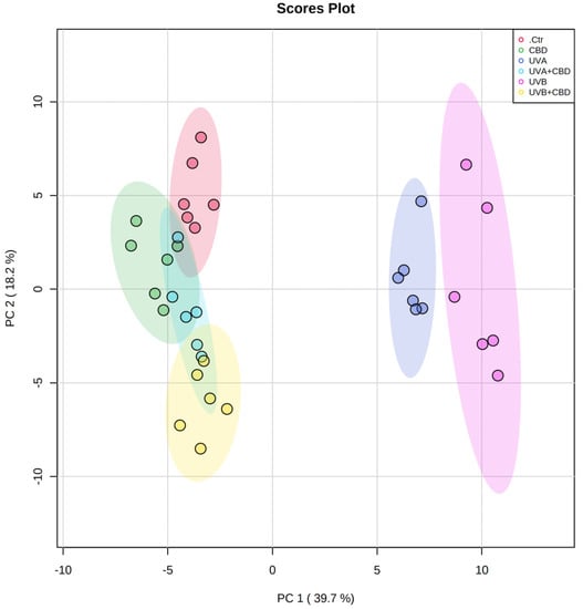 In the PCA, PC1 mainly explains the variation between the cluster of plasma samples from control rats (Ctr) and rats that were topically treated with CBD, which were separated from each other and scattered in the left region of the plot. In the right region of the plot, we can observe four poorly separated groups, namely UVA, UVB, UVA+CBD, and UVB+CBD, although clustering can be observed depending on the treatment (UVA or UVB).