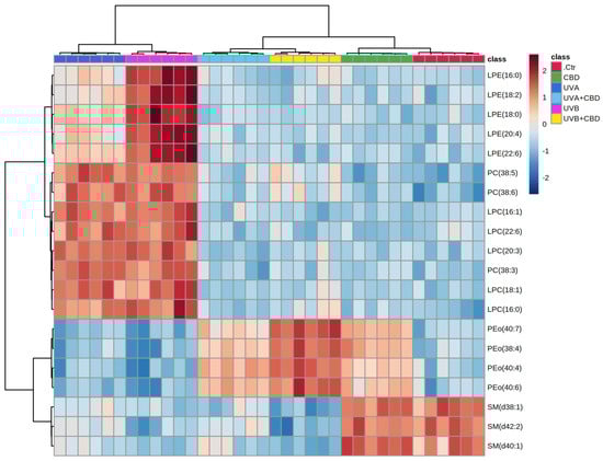 Two-dimensional hierarchical clustering heat map of the 20 most discriminating phospholipid species (according to one-way ANOVA) identified in the plasma of control (Ctr) and rats irradiated with UVA (increasing doses from 0.5 to 5 J/cm2 for 4 weeks) or rats irradiated with UVB (increasing doses from 0.02 to 2 J/cm2 for 4 weeks). These animals have not been treated (Ctr, UVA, and UVB) or have been topically treated with CBD (CBD, UVA+CBD, and UVB+CBD) (2.5 g CBD in 100 g petrolatum). Levels of relative abundance are indicated on the color scale, with numbers indicating the fold difference from the grand mean. The clustering of the sample groups is represented by the dendrogram on the top. The clustering of individual phospholipid species with respect to their similarity in the change in relative abundance is shown by the dendrogram to the left. Abbreviations: CBD, cannabidiol.