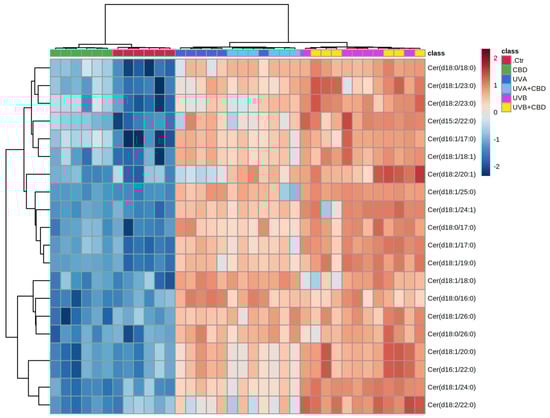 Two-dimensional hierarchical clustering heat map of the 20 most discriminating ceramide species (according to one-way ANOVA) identified in the plasma of control (Ctr) and UVA-irradiated rats (increasing doses from 0.5 to 5 J/cm2 for 4 weeks) or UVB-irradiated rats (increasing doses from 0.02 to 2 J/cm2 for 4 weeks). These animals have not been treated (Ctr, UVA, and UVB) or have been topically treated with CBD (CBD, UVA+CBD, and UVB+CBD) (2.5 g CBD in 100 g petrolatum). Levels of relative abundance are indicated on the color scale, with numbers indicating the fold difference from the grand mean. The clustering of the sample groups is represented by the dendrogram on the top. The clustering of individual ceramide species with respect to their similarity in the change of relative abundance is represented by the dendrogram to the left. Abbreviations: CBD, cannabidiol.