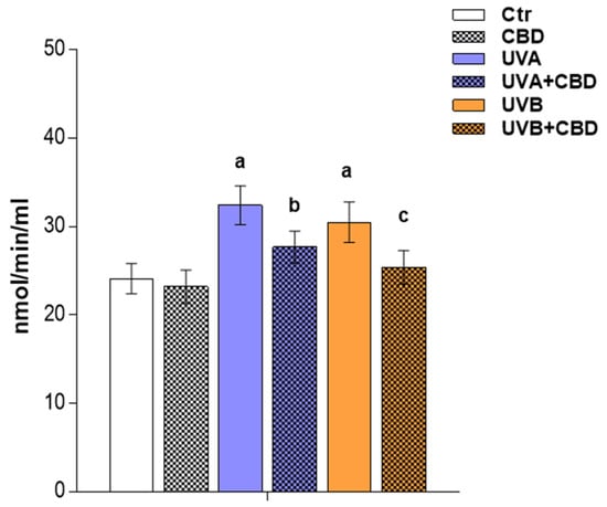 Activity of phospholipase A2 (PLA2) in the plasma of control rats (Ctr) and rats irradiated with UVA/UVA (UVA in increasing doses from 0.5 to 5 J/cm2 for 4 weeks; UVB in increasing doses from 0.02 to 2 J/cm2 for 4 weeks) treated and not treated with CBD (2.5 g CBD in 100 g petrolatum). Values are mean ± SD, p < 0.05; a—significantly different from control; b—significantly different from the rats irradiated with UVA; c—significantly different from the rats irradiated with UVB.