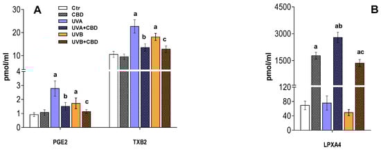 Our results also confirmed that topical UV radiation and topical application of CBD significantly affect plasma levels of eicosanoids (Figure 6). We found increased levels of proinflammatory eicosanoids, prostaglandin PGE2, and thromboxane TXB2 in the plasma of rats exposed to UVA and UVB, while the content of the anti-inflammatory lipoxin LPXA4 was similar to that of plasma from the control rats (Figure 6).