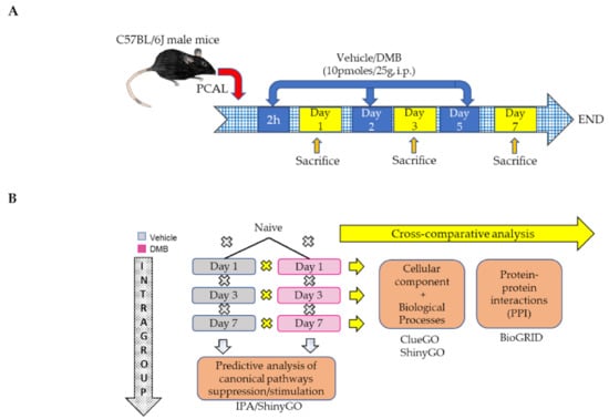 Schematics. C57BL/6J male mice (except naïve) were treated with either 10 pmoles of DMB or vehicle (DMSO) 2 h after permanent coronary artery ligation (PCAL) surgery and every other day or two (n = 3/group). Mice were sacrificed after 1, 3 or 7 days of surgery. (A) An in vivo model of PCAL surgery and treatment; (B) in silico analysis schematic: samples followed the intragroup analysis, when each time point was compared to its preceding time point in each group, separately; or samples followed a cross-comparative analysis, when protein expression from DMB-treated mice was compared to protein expression in the vehicle-treated group at each time point. i.p., intraperitoneal; IPA, ingenuity pathway analysis.