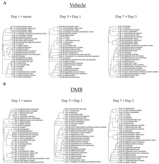 Top 30 cellular components of the unique proteins and DEPs in the intragroup comparison. The expression of proteins from each time point was compared to its preceding time point intragroup to identify unique proteins and DEPs (p < 0.05). A list containing all unique proteins and DEPs at each time point was uploaded on ShinyGO v0.61 and cellular components were obtained. Cellular components were clustered according to the amount of proteins they have in common, and the size of the blue dots represent p-values (the bigger the size, the lower the p-value). (A) Cellular components of unique proteins and DEPs in the vehicle-treated group; (B) cellular component of unique proteins and DEPs in the DMB-treated group.