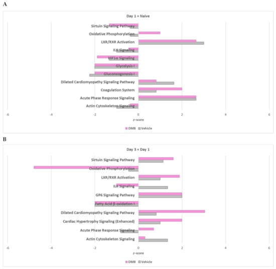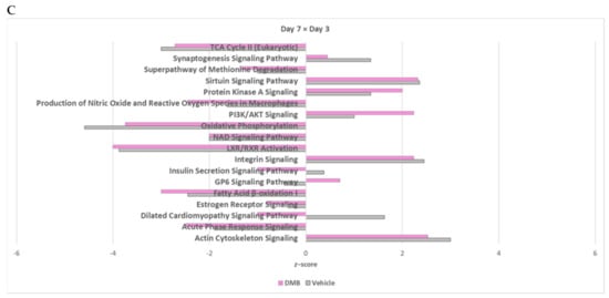 Through core analysis on IPA we could determine z-scores and predict activation (positive z-score) or inhibition (negative z-score) of canonical pathways according to the protein expression patterns of each group (Figure 3A–C and Table 1). DMB-treated mice demonstrated increased expression of oxidative phosphorylation (OXPHOS) components on day 1 compared to naïve mice, with downregulation of the sirtuin and glycolysis pathways. Compared to day 1, hearts from day 3 showed less OXPHOS, fatty acid oxidation (FAO) and amino acid degradation, but enhanced the sirtuin signaling pathway. The TCA cycle was suppressed in parallel with the repression of the NAD signaling pathway. Day 7 post-PCAL presented further suppression of FAO, OXPHOS, NAD signaling pathway and the TCA cycle, accompanied by downregulation of the metabolism of ketone bodies, acetyl-CoA biosynthesis, glutaryl-CoA and amino acid degradation, but promotion of glycolysis and the sirtuin signaling pathway in the DMB-treated group. Different from DMB-treated mice, hearts from vehicle-treated mice showed downregulation of OXPHOS, the TCA cycle and the NAD signaling pathway on day 1 post-PCAL compared to naïve mice. Moreover, FAO was downregulated on day 3 compared to day 1, and OXPHOS followed subsequent inhibition, which was also predicted on day 7, while the sirtuin signaling pathway was upregulated. Changes in NAD signaling pathway were not evident on day 3 compared to day 1 in vehicle-treated mice, but were further downregulated on day 7 post-PCAL compared to day 3, accompanied by a downregulation of proteins from the TCA cycle in the vehicle-treated group. These data suggest that the timing for mitochondrial turnover is different between control vs. treated mice after PCAL. DMB’s mechanism of action may also involve sustained changes to multiple cellular metabolic pathways.
