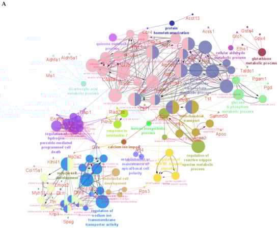 GO analysis on ShinyGO was used to identify biological processes from the unique proteins and DEPs between DMB vs. vehicle-treated mice on days 1, 3 and 7 post-PCAL, followed by a parallel analysis by ClueGO with the generation of networks for biological processes and identification of unique proteins and DEPs associated to the pathways. The main biological processes that were identified by ShinyGO revealed a central role of DMB in regulating small molecule metabolic processes and redox signaling throughout the first week post-PCAL (Figure S3). Day 1 (Figure S3A) demonstrated an overall impact of DMB in the ATP metabolic process and in the metabolism of carbohydrate derivatives, culminating in stronger effects in the generation of precursor metabolites and energy on day 3 (Figure S3B), with evident alterations in lipid metabolism on day 7 (Figure S3C). A parallel analysis by ClueGO showed similar biological processes compared to the ShinyGO analysis (Figure 5 and Figure S4). Day 1 demonstrated major effects of DMB on cellular respiration and on the purine ribonucleoside triphosphate metabolic process, which includes ATP synthesis. These changes were paralleled by DMB regulation of cell death and ROS metabolism, with alterations in other metabolic pathways including ketones and glucose-6-phosphate (Figure 5A and Figure S4A). On day 3, the most enriched pathways identified by ClueGO were related to the generation of precursor metabolites and energy, electron transfer activity and ATP synthase activity; ROS metabolism continued to be a DMB-targeted pathway and the first effects on FAO and FA transport were manifested (Figure 5B and Figure S4B). On day 7, DMB therapy showed the effects on the aerobic electron transport chain, an enhanced impact on FAO and differential modulation of acyl-CoA and branched-chain amino acid metabolism. These changes were accompanied by the continued regulation of the metabolic process and cell redox homeostasis (Figure 5C and Figure S4C). The data demonstrate that intermittent administration of DMB beginning 2 h after infarction continuously modulates ROS and multiple metabolic pathways throughout the course of early remodeling, especially FAO, and this provides novel and valuable insights into the beneficial effects of GLP1 receptor agonism in the heart.