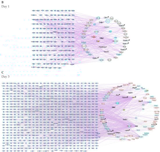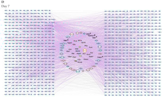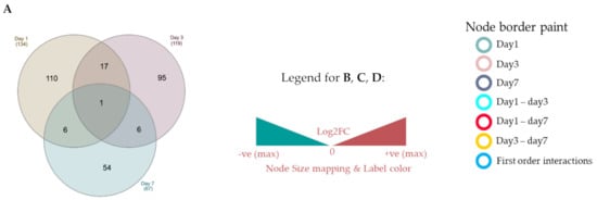 Protein–protein interaction (PPI) networks of unique proteins and DEPs identified in the cross-comparison analysis. A cross-comparative analysis was done at each time point (1, 3 or 7 days after PCAL) to identify unique proteins and DEPs (p < 0.05). (A) Venn diagram of unique proteins and DEPs identified in the DMB vs. vehicle comparison; (B) PPI network of unique proteins and DEPs on day 1 post-PCAL; (C) PPI network of unique proteins and DEPs on day 3 post-PCAL; (D) PPI network of unique proteins and DEPs on day 7 post-PCAL. * Protein unique to the DMB group for that day. # Protein unique to the vehicle group for that day.
