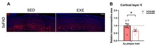 Effects of regular exercise on cortical Aβ load in the 5xFAD mouse model. (A) Representative images of Aβ staining in cortical layer V of 5xFAD-SED and 5xFAD-EXE mice. Scale bar 200 μm. (B) Percentage of immunoreactive area was quantified to measure Aβ content in cortical layer V. All data are relative to 5xFAD-SED and presented as mean ± SEM. n = 8/group. «#» exercise effect: # p < 0.05.
