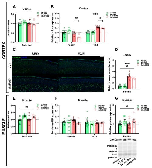 To assess the effect(s) of exercise on iron load, we measured the mRNA expression and protein level of ferritin, the main iron storage protein, in cortex and muscle tissues. Quantitative PCR (qPCR) analysis revealed no changes in mRNA expression of ferritin between WT and 5xFAD mice, neither in cortex (genotype × exercise interaction: p < 0.01, post hoc test: p = 0.5, Figure 2B) or muscle tissues (main genotype effect: p = 0.8, Figure 2F). However, physical exercise induced a significant reduction in the mRNA expression level of ferritin in the cortex of 5xFAD-EXE mice in comparison with 5xFAD-SED mice (genotype × exercise interaction: p < 0.01, post hoc test: p < 0.01, Figure 2B).