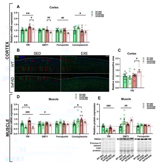 Iron uptake in the brain is regulated by transferrin receptor (TfR) and divalent metal transporter 1 (DMT1) [28]. To investigate the effect of physical exercise on iron uptake, the mRNA and protein level of TfR, which is responsible for Fe3+ uptake, were evaluated in cortex and muscle tissues. qPCR analysis demonstrated that the mRNA expression of TfR was upregulated in the cortex (main genotype effect: p < 0.01, Figure 3A) of 5xFAD mice and in the muscles of 5xFAD-SED mice when compared to WT-SED mice (genotype × exercise interaction: p = 0.07, post hoc test: p < 0.01, Figure 3D). Physical exercise induced a significant reduction of cortical TfR mRNA expression in 5xFAD-EXE mice when compared to 5xFAD-SED mice (genotype × exercise interaction: p = 0.06, post hoc test: p < 0.05, Figure 3A) and in all exercised mouse muscles (main exercise effect: p < 0.0001, Figure 3D).