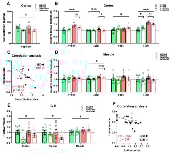 Effects of regular exercise on iron homeostasis regulation in cortex and muscle tissues in 5xFAD mouse model. (A) Hepcidin level in cortex was measured by ELISA and normalized to total protein concentration. (C) Correlation analysis for total iron content in muscle and hepcidin level in cortex was performed for all mice, r–Pearson correlation coefficient. mRNA expression of STAT3, JAK1, PTPe, and IL-6R in cortex (B) and muscle (D) was measured by qPCR. (E) IL-6 level in cortex, plasma, and muscle protein samples was measured by CBA. (F) Correlation analysis for total iron content in muscle and IL-6 level in cortex was performed for all mice. All data are presented as mean ± SEM. n = 6–10/group. «*» genotype effect, «#» exercise effect: *** p < 0.001, * p < 0.05, ## p < 0.01, # p < 0.05. General genotype/exercise effect among all groups is presented as a line with «*»/«#» sign on top, exercise effect in 5xFAD or WT mice separately is presented as a bracket with «#» sign/p value on top, genotype effect in SED mice only is presented as a bracket with p value on top.