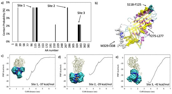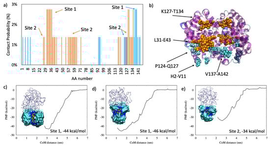 Hemoglobin interacts with two main and extended binding sites, reported in Figure 4. The main binding site is located on residues L31-E43 and V137-A142, and it has a higher PMF with respect to the Site 2. In this case, the binding site is mainly located on residues K127-T134, and the protein is oriented upward with respect to the AuNP surface, as shown in Figure 4e. Hemoglobin interacts with almost all of the amino acids with the AuNP because this protein is small and globular, and the same trend was observed for hemoglobin interacting with citrate-capped AuNP [].