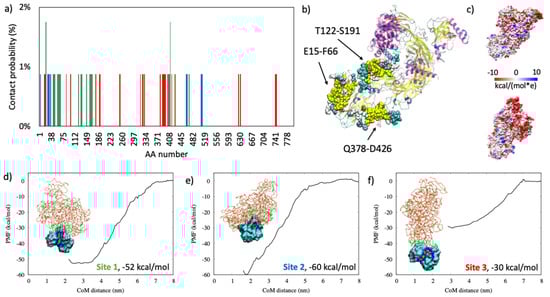 In panel (a): the contact probability for each residue upon complement c3 binding to all-MUS AuNP. Each color represents a different binding site. Amino acids over 800 are removed for clarity because their contact probability was zero. In panel (b): the graphical representation of the most probable binding sites in VdW, colored accordingly to the protein secondary structure. In panel (c): the coulombic surface of complement C3 as viewed from the front (top) and back (bottom). Colors represent the coulombic potential as shown in the legend. In panels (d–f): the three binding modalities with the relative PMF curve.