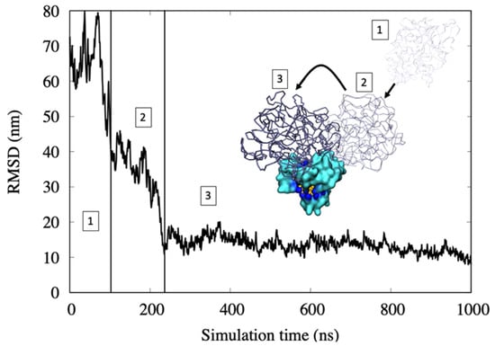 Moreover, in the case of hemoglobin, we observed that the adsorption over all-MUS AuNP happens in three steps, as previously found for citrate-capped AuNP [,]. Figure 5 shows the RMSD of the center of mass of the hemoglobin during the adsorption on the AuNP and where the binding happens through the following process: