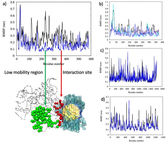 The root mean square fluctuation (RMSF) of the protein reported in Figure 6 is a measure of the mobility of each amino acid. By comparing the RMSF before and after binding, we observed that small proteins, such as α1-antiproteinase, are less flexible after binding, in particular, as expected, this can be observed for residues in contact with the AuNP. In the case of medium-size proteins such as serum albumin, the amino acids close to the AuNP (residues from 350 to 400) have reduced mobility with respect to the free protein. Interestingly, the amino acid regions comprised from residues 200 to 300 show a significantly lower mobility despite it lying farther from the binding site (this region is highlighted with green spheres in Figure 6), while all of the remaining amino acids remain flexible, as is the case in the free protein. This finding suggests that binding to AuNP could alter the protein structure directly involved and in near proximity to some extent, but long-range effects cannot be neglected. Moreover, for bigger proteins, as is the case with complement C3, we observed very small changes in the RMSF in close proximity to the binding site and to the most flexible residues, such as those forming loops that lie in the exterior of the protein, as shown in Figure 6c.