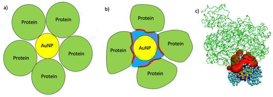 This Equation (2) is based on the effective surface occupied by a single protein over the AuNP obtained by MD simulations, and it is intrinsically dependent on not only the protein shape and size but also on the affinity of the protein binding site to AuNP and on the possible displacement of the ligands that cap the AuNP. The displacement of the ligands and the adaptation of the proteins to the NP surface have already been found for not only the proteins adsorbed on NPs but also for those on flat surfaces due to the interactions with the metals and with the ligands that cap the nanomaterial [,,,,,,]. As shown in Figure 7c, proteins as Complement C3 tend to interact with capped AuNPs in the site that yields more efficient binding with the effect of increasing the contact surface.