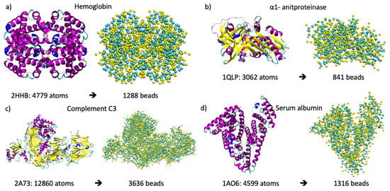 In each panel on the left, the representations of the three-dimensional structures of the proteins where secondary structure elements are represented in cartoons are shown, and on the right, the CG Martini model is shown, where cyan spheres are related to the backbone beads and the yellow is related to the side chains. In panel (a) hemoglobin; (b) α1-antiproteinase; (c) serum albumin; and (d) complement C3. Below each protein, the PDB ID, the number of atoms at the atomistic level, and the number of beads at the cg level are shown.