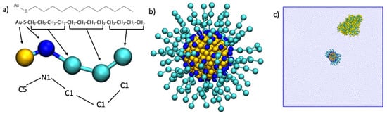 The gold nanoparticle was built as a truncated octahedron with a face-centered cubic (fcc) lattice with a core diameter of 2.2nm and consisting of 314 atoms []. The gold core is capped at the atomistic level with MUS ligands, as reported in Figure 9. To obtain the CG model, we mapped the atomistic NP according to the Martini scheme [], according to the work of Salassi et al. []. In particular, both the gold and sulfur atoms of the MUS are mapped at a ratio of 1:1, and they were kept fixed during the simulations. The MUS ligands were mapped at a ratio of 4:1 by employing three “C1” beads to represent the carbon chain and “N0” for the S atom. The gold atoms were represented with “C5” beads. Parameters of the CG force field for the all-MUS AuNP can be retrieved from Salassi et al. []. In brief, the N1 and C1 beads of each MUS were connected with a harmonic potential with kbond = 1250 kJ/ mol nm2 and with a harmonic cosine potential with kangle = 25 kJ/mol nm2 and θ = 180 deg.
