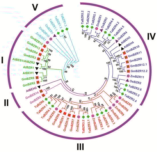 - Li, Y.; He, L.; Li, J.; Chen, J.; Liu, C. Genome-wide Identification, Characterization, and Expression Profiling of the Legume BZR Transcription Factor Gene Family. Front. Plant Sci. 2018, 9, 1332. [Google Scholar] [CrossRef] [PubMed]