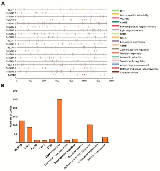 2.5. Cis-Acting Regulatory Elements (CAREs) Analysis of TaBZR Genes