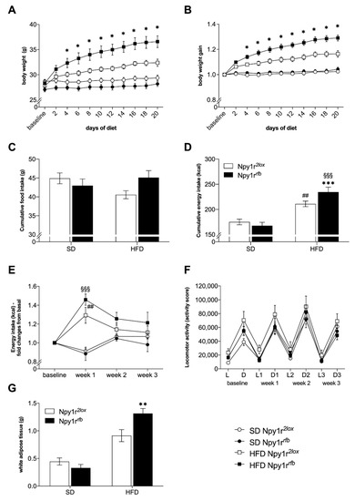 Metabolic consequences of HFD in Npy1r2lox and Npy1rrfb male mice. (A) Body weight growth, (B) body weight gain, (C) cumulative food intake (g), (D) cumulative energy (kcal) intake and (E) weekly energy intake (kcal) of SD- and HFD-fed Npy1r2lox and Npy1rrfb mice during the metabolic challenge procedure. (F) Spontaneous locomotor activity of Npy1r2lox and Npy1rrfb male mice exposed to SD or HFD for 21 days. (G) White adipose tissue weight (g) of Npy1r2lox and Npy1rrfb male mice exposed to SD or HFD for 26 days. Data are presented as mean ± SEM. Food intake was calculated as means of the sum of grams for mouse (C); energy intake was calculated as means of the sum of kilocalories (D) for mouse and as fold changes versus baseline (E). (A,B) * p < 0.05 versus Npy1r2lox on HFD; (D) *** p < 0.001 versus Npy1r2lox on HFD, ## p < 0.01 versus Npy1r2lox on SD, §§§ p < 0.001 versus Npy1rrfb on SD; (E) ## p < 0.01 versus Npy1r2lox on SD, §§§ p < 0.001 versus Npy1rrfb on SD; (G) ** p < 0.01 versus Npy1r2lox on HFD.