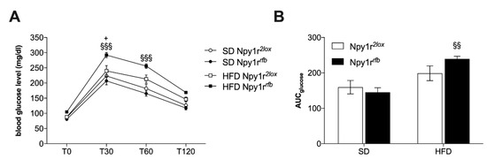 (A) Glucose tolerance test and (B) area under the curve (AUC) of Npy1r2lox and Npy1rrfb male mice 21 days after SD or HFD exposure. Data are presented as mean ± SEM. (A) + p = 0.067 versus Npy1r2lox on HFD, §§§ p < 0.001 versus Npy1rrfb on SD; (B) §§ p < 0.01 versus Npy1rrfb on SD.