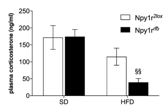 Corticosterone levels. Npy1rrfb mice on HFD showed a significant reduction of corticosterone plasma levels compared to the SD-fed group. Values are presented as mean ± SEM. §§ p < 0.01 versus Npy1rrfb on SD.