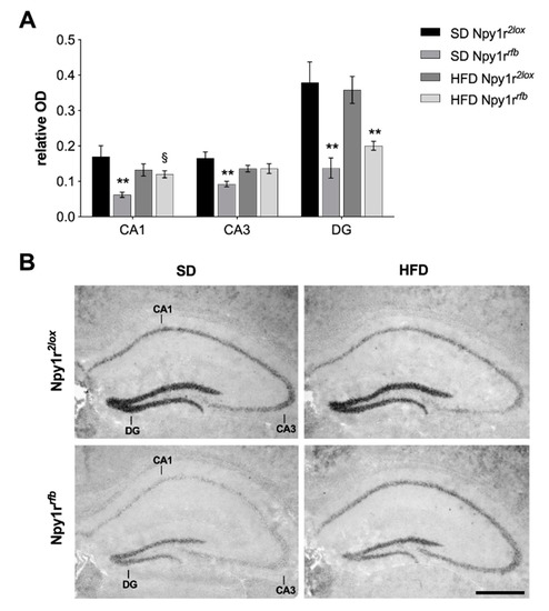 Npy1r mRNA expression in the hippocampus of Npy1r2lox and Npy1rrfb mice fed with SD and HFD. (A) Npy1r mRNA expression in the hippocampus of Npy1r2lox and Npy1rrfb mice fed with SD and HFD. (B) Representative pictures showing Npy1r mRNA signal intensity differences in the CA1, CA3 and DG of SD- and HFD-fed Npy1r2lox and Npy1rrfb male mice. Scale bars: 250 μm. CA1, cornu ammonis 1 hippocampal subregion; CA3, cornu ammonis 3 hippocampal subregion; DG, dentate gyrus. Values are presented as mean ± SEM (A). ** p < 0.01 versus Npy1r2lox mice. § p < 0.05 versus Npy1rrfb mice on SD. Scale bars: 500 µm.