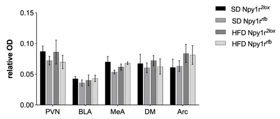 Relative optic densities (OD) of Npy1r mRNA expression in the hypothalamus and amygdala of Npy1r2lox and Npy1rrfb mice fed with SD and HFD. PVN, paraventricular hypothalamic nucleus; DM, dorsomedial hypothalamic nucleus; ARC, arcuate hypothalamic nucleus; BLA, basolateral amygdala; MeA, medial amygdala.
