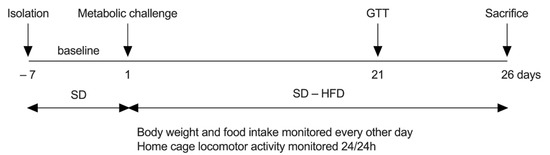 Five days after the GTT test (day 26) and following 12 h of fasting, mice were euthanized by decapitation after a brief CO2 exposure. Trunk blood was collected in heparinized tubes (Sarstedt, Nümbrecht, Germany), centrifuged at 4000 RPM, 4 °C for 10 min and stored at −20 °C until analysis. Visceral white adipose tissue (perigonadal, mesenteric, retroperitoneal, perirenal fat pads) was collected and weighed, then frozen in liquid nitrogen for later analysis. Brains were removed and immediately frozen in liquid nitrogen, then stored at −80 °C until analysis.