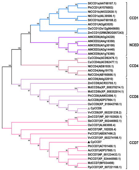 Phylogenetic analysis of CCD family proteins belonging to different plant species. The deduced amino acid sequences of CCD family proteins were aligned using ClustalW in BioEdit Sequence Alignment Editor. Phylogenetic tree was constructed using the neighbor joining (NJ) method, with 1000 bootstrap replicates, using MEGA6.0. At, Arabidopsis thaliana; Os, Oryza sativa; Ph, Petunia hybrida; Zm, Zea mays; Nt, Nicotiana tabacum; Sl, Solanum lycopersicum; Pt, Populus trichocarpa; Vv, Vitis vinifera; Ac, Actinidia chinensis; Pp, Prunus persica; Rd, Rosa damascene; Cs, Crocus sativus; Ps, Pisum sativum; Md, Malus domestica; Sb, Sorghum bicolor. CpCCD7 and CpCCD8 are marked with gray and black triangles, respectively.