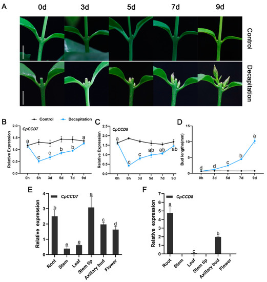 Expression analysis of CpCCD7 and CpCCD8 in wintersweet. (A) Lateral branch formation process in wintersweet. Scale bar = 1 cm. (B,C) Expression levels of CpCCD7 (B) and CpCCD8 (C) in wintersweet during the lateral branch formation process. (D) Bud length (mm) after decapitation. (E,F) Expression levels of CpCCD7 (E) and CpCCD8 (F) in different tissues. In (F), lack of data in stem, stem tip and flower tissues implies that the expression of CpCCD8 was below the detection threshold. Expression levels of CpCCD7 and CpCCD8 were normalized to those of CpAcTin and CpTublin. Data represent mean ± standard error (SE) of three technical replicates. Different lowercase letters (a–e,ab) above bars indicate significant differences (p < 0.05).