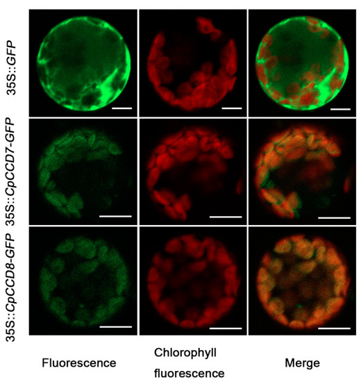 Subcellular localization analysis of GFP-tagged CpCCD7 and CpCCD8. GFP-tagged CpCCD7 and CpCCD8 genes were expressed in Arabidopsis protoplasts. The 35S::GFP construct was used as the control. Green color indicates GFP signal (left panel); red color indicates chlorophyll autofluorescence (middle panel); yellow indicates the merged signal (right panel). Scale bar = 10 µm.