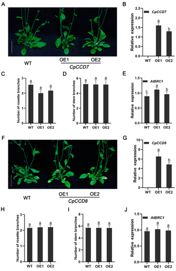 Branching phenotype of CpCCD7-OE and CpCCD8-OE lines. (A) Rosette branching phenotype of CpCCD7-OE plants at 35 d after transplant. (B) Expression level of CpCCD7 in transgenic and WT plants. (C) Number of rosette branches in CpCCD7-OE lines and the WT. (D) Number of stem branches in CpCCD7-OE lines and the WT. (E) Expression level of AtBRC1 in CpCCD7-OE lines and WT. (F) Rosette branching phenotype of CpCCD8-OE plants at 35 d after transplant. (G) Expression levels of CpCCD8 in transgenic and WT plants. (H) Number of rosette branches in CpCCD8-OE lines and WT plants. (I) Number of stem branches in CpCCD8-OE lines and WT plants. (J) Expression level of AtBRC1 in CpCCD8-OE lines and WT plants. Data represent the mean ± standard deviation (SD; n = 20–60). In (A,F), scale bars = 3 cm. In (B–E,G–J), different lowercase letters (a,b) above the bars indicate significant differences (p < 0.05).