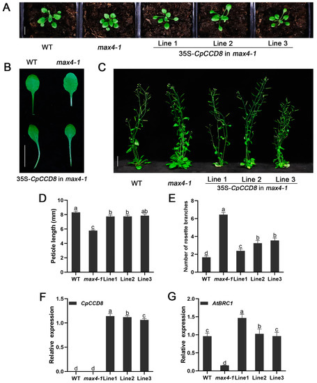 By observing the leaf shape of 14-d-old of WT, max3-9, max4-1 and complementation lines, we found that the petiole length of mutants was shorter than that of the WT (max3-9, 5.81 ± 0.1 mm; max4-1, 5.79 ± 0.1 mm; WT, 8.32 ± 0.2 mm), whereas that of complementation lines and WT plants showed no significant differences; the petiole lengths of CpCCD7 complementation lines 1, 2 and 3 were 7.85 ± 0.2, 7.56 ± 0.2 and 7.55 ± 0.2, respectively (Figure 6A,B,D), whereas those of CpCCD8 complementation lines 1, 2 and 3 were 7.75 ± 0.2, 7.76 ± 0.2 and 7.86 ± 0.2, respectively) (Figure 7A,B,D). Approximately 35 d after transplant, the rosette branches of WT plants, mutants and complementation lines were observed, the number of rosette branches of max3-9 and max4-1 mutants were significantly higher (6.13 ± 0.1 and 6.45 ± 0.3, respectively) than of WT plants (1.7 ± 0.2), while the number of rosette branches of complementation lines were similar with WT plants; the number of rosette branches was 1.75 ± 0.2, 1.85 ± 0.3 and 2.15 ± 0.2 in CpCCD7 complementation lines 1, 2 and 3, respectively (Figure 6C, E), and 2.39 ± 0.2, 3.25 ± 0.3 and 3.55 ± 0.3 in CpCCD8 complementation lines 1, 2 and 3, respectively (Figure 7C,E). We also examined the expression level of AtBRC1 in WT, mutant and complementation lines. The results showed that overexpression of both CpCCD7 and CpCCD8 up-regulated the expression of AtBRC1 in complementation plants (Figure 6G and Figure 7G). Together, these results indicate that the functions of CpCCD7 and CpCCD8 in branch development are conserved in wintersweet, and both genes perform their function by regulating the transcription of BRC1.