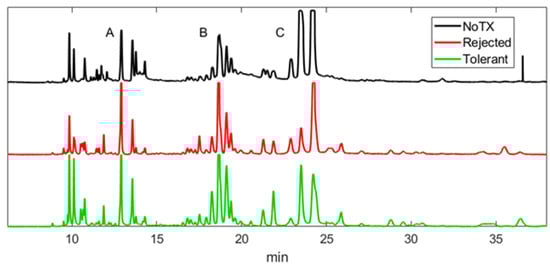 Representative electropherograms (EPGs; shown as voltage versus time in minutes) generated in aqueous humor (AQH) samples obtained from non-transplanted control mice (NoTX; black) and transplant recipients that either rejected (red) or tolerated (green) their intraocular islet allografts. The EPGs showed distinct peak patterns across the experimental groups. Three groups of peaks (corresponding to amino acids and small primary amines) and some ghost peaks were consistently distinguished in each EPG and were designated as group A, B and C. Although the experimental conditions of animals (i.e., NoTX, rejected, tolerant) had a similar general pattern, the number of individual features/metabolites (peaks) and their abundance (peak amplitude/area) within each group were very different among the experimental groups.