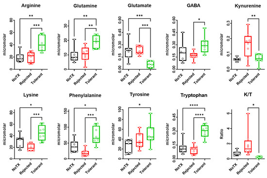 Consistently with arginine, phenylalanine and lysine, tryptophan was also markedly increased in the AQH of the tolerant mice compared with rejecting ones, and there was no difference between the latter and the non-transplanted controls. Since we did not supplement the mouse diet in these studies with any amino acid, the increase in the tryptophan levels could be attributed to a blockade in the metabolic pathways that utilize it. Tryptophan can potentially be (1) utilized as a building block of proteins; (2) metabolized through the tryptophan–kynurenine pathway; and (3) converted to serotonin, melatonin, and some other monoamines. The tryptophan–kynurenine pathway has been investigated in the context of organ transplant and the kynurenine/tryptophan (K/T) ratio increases in inflammation and transplant rejection [39]. Consequently, a decrease in the K/T ratio is considered anti-inflammatory, consistent with immune regulation and tolerance [40]. Here, we found that the K/T ratio in the AQH of mice with intraocular islet grafts was significantly higher in the rejecting recipients (by ANOVA) and lower (p < 0.05 by t-test) in tolerant ones when compared to non-transplanted controls; thus, demonstrating that the tryptophan–kynurenine pathway is actively upregulated in rejection and downregulated during tolerance.