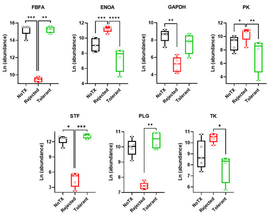 We performed untargeted proteomics analysis by LC-MS/MS (liquid chromatography-mass spectrometry) in AQH samples obtained from transplant recipient mice that either rejected or tolerated their intraocular islet allografts as well as from non-transplanted controls for comparison. Several proteins directly or indirectly related to the Warburg effect and inflammation were identified and quantified among 170 proteins measured in all samples without exception (see Table S1 in Supplementary Materials for a complete list of identified proteins). The proteins related to the Warburg effect included fructose bisphosphate aldolase (FBFA), alpha enolase (ENOA), glyceraldehyde-3-phosphate dehydrogenase (GAPDH), pyruvate kinase (PK), serotransferrin (STF), plasminogen (PLG; plasmin heavy chain A), and transketolase (TK). Figure 3 shows side-by-side comparisons of each protein across the non-transplanted control group (NoTX) and the transplant recipients that either rejected or tolerated their allografts. All shown proteins had some significant difference in their relative abundance in the local microenvironment of the islet allografts (represented in AQH) across the experimental groups as indicated. Comparisons were done by ANOVA followed by Tukey’s multiple comparison test (also see Table 2). The data showed that STF, PLG, FBFA, and GAPDH significantly decreased and, conversely, ENOA and PK increased in the rejected group when compared with the NoTX controls. None were significantly different in the tolerant group when compared with controls. However, all seven proteins changed in opposite directions in the tolerant and rejected groups with six out of seven showing significant differences in rejection versus tolerance.