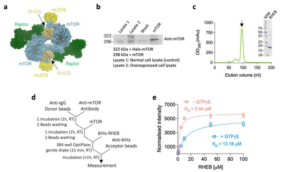Binding kinetics of RHEB–mTOR. (a) Molecular structure of homodimeric mTORC1 showing the complex components except DEPTOR and PRAS40 (PDB ID: 6BCU) solved by the cryo-EM. (b) Western blot analysis of the different stages of mTOR purification showing the overexpression of the Halo-tagged mTOR. See the whole view of the blot in Figure S2b. (c) Gel-filtration profile and the corresponding Coomassie brilliant blue R-250 stained SDS–PAGE (cropped from the full gel image in Figure S3d) of the purified 6xHis–RHEB (MW: Molecular Weight; kDa). The arrow indicates the elution peak to be analyzed. The weak band above 37 kDa marker corresponds to the protein dimer. (d) Protocol of AlphaLISA® assay to measure the binding affinity of RHEB for mTOR. Different concentrations of 6xHis–RHEB and excess amount of anti-6His acceptor beads were used (see Figure S4 for details). RT, room temperature. (e) Binding of RHEB to mTOR in the presence (blue plot) or absence (red plot) of GTPγS. Data are shown as mean of two independent experiments (n = 3 replicates each) ± standard deviation (SD). The signal was normalized to the baseline. The equilibrium dissociation constants (KD) are shown.