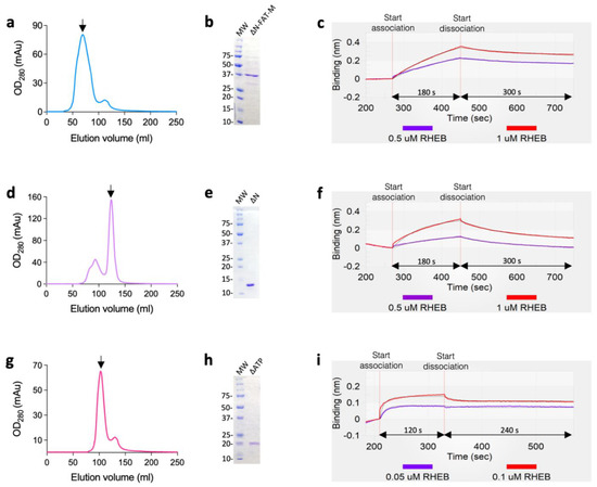 Binding kinetics of RHEB with mTOR fragments (1 µM) measured by BLItz. (a,b) Gel filtration profile (a) and the corresponding Coomassie brilliant blue R-250 stained SDS–PAGE (b) of ∆N-FAT-M. See Figure S6d for full gel image. (c) Binding of RHEB to ΔN-FAT-M with association and dissociation phases of 180 s (270–450 s) and 300 s (450–750 s), respectively. (d,e) Gel filtration profile (d) and a representative Coomassie brilliant blue R-250 stained SDS–PAGE (e) of ∆N. See Figure S7e for full gel image. (f) Binding of RHEB to ΔN with association and dissociation phases of (270–450 s) and 300 s (450–750 s), respectively. (g,h) Gel filtration profile (g) and a representative Coomassie brilliant blue R-250 stained SDS–PAGE (h) of ∆ATP. See Figure S8e for full gel image. (i) Binding of RHEB to ΔATP with association and dissociation phases of 120 s (210–330 s) and 240 s (330–570 s), respectively. Global fitting was carried out for 1:1 binding kinetics. The calculated parameters are shown in Table 1. The arrows indicate the elution peaks used for the analysis.