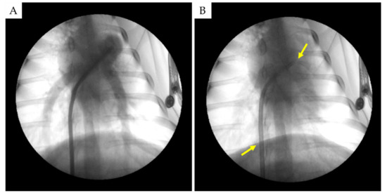 (A) Pulmonary artery angiography in sheep №1. (B) The laser catheter (arrow) is placed through the steerable sheath (arrow) in the PA trunk. Sheep №1.