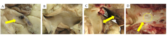 Fifteen lesions were visually identified during PA gross anatomical evaluation. The lesions observed in the PA were inhomogeneous. In sheep №1, evident laser-related lesions described as irregular brown hemorrhage spots were observed in the PA trunk (Figure 3A); in Sheep №2, no lesions were observed during gross anatomy evaluation before fixation (Figure 3B); and in Sheep №3, rough defects and lung collateral lesions were evident (Figure 3C,D).